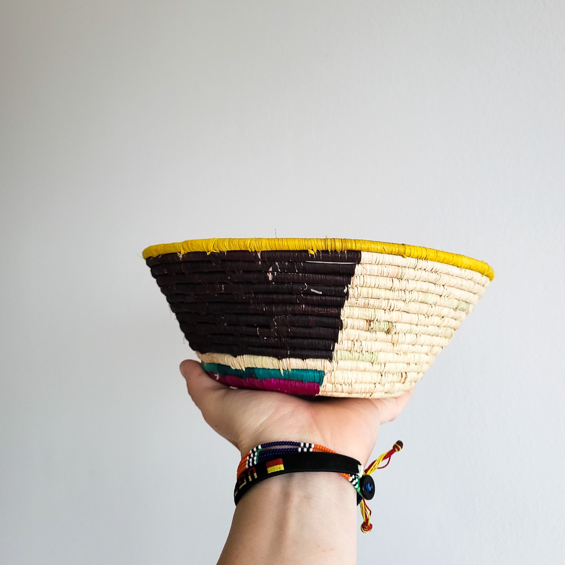 uvázaná z ugandských lokálních přírodních materiálů / opletená světlým x hnědým lýkem